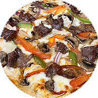 Tomato Sauce Base, Mozzarella Cheese, Red Onions, Green Peppers, Red Peppers, Mushrooms, Marinated Beef